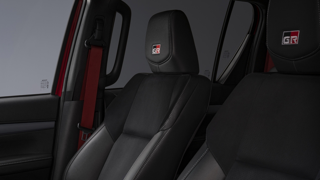 Binnenin de Hilux GR SPORT II worden inzittenden omringd door sportieve elementen die de passie voor motorsport achter de GR SPORT benadrukken. Een zwart, monochroom thema zorgt voor een stijlvolle uitstraling en wordt vergezeld door opvallende rode accenten, zoals contrasterende rode veiligheidsgordels.